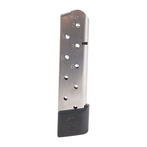 SPECS: Stainless steel body and follower. .45 ACP, fits 1911 Auto only. Mag. 8 - 8-round capacity.