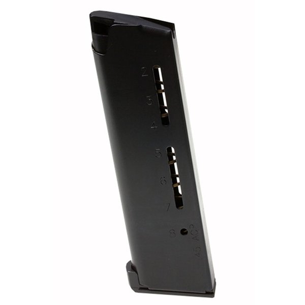 Každý zásobník má čísla od 1 do 10 vyražená na dně, což usnadňuje sledování používání a výkonu. .45 ACP vyhovuje modelu Gov’t; kapacita 8 nábojů; čísla pro počítání nábojů jsou vyražena na těle vedle světlých otvorů.