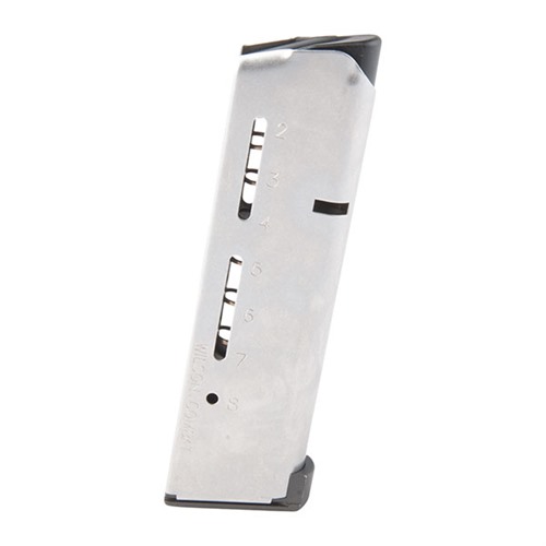 Ultra-Reliable, Extra-Capacity & Smooth Feeding Of All The Rounds Wilson Combat applied 30 years of experience building high-performance 1911 magazines to develop this ultra-reliable magazine for combat, competition, or self-defense. Made with state-of-the-art materials using the latest manufacturing technology, these single-stack magazines are built tough to keep running in unforgiving, real-world conditions. The body is formed from extra-thick stainless steel, with the radius of each curve engineered to minimize stress points, virtually eliminates feed lip cracking and stress fatigue. Even the position of the witness slots toward the rear is designed to enhance structural integrity. A proprietary welding, deburring, and polishing process provides an unusually strong, super-smooth seam to ensure snag-free follower movement and easy insertion in the mag well. The non-tilt follower of self-lubricating polymer fully supports the ammo stack to prevent nose-dives, double feeds, and other hang-ups. The mag body design puts less tension on the spring than standard magazines, increasing spring life and making it easy to seat a fully loaded magazine with the slide closed. The polymer base pad adds minimal bulk yet ensures a firm purchase even when your hands are wet; removes easily for cleaning. Numbers 1 through 10 stamped on the bottom help you mark each of your magazines to track usage and performance. .45 ACP fits Gov’t Model; 8 round capacity; round-count numbers stamped on body next to witness holes. Available in natural Silver or Black Oxide finish in singles or in convenient, money-saving 3-Paks with or without a Michael’s of Oregon double mag pouch of rugged, high-impact Kydex® molded polymer. ETM MAX Magazines feature the MAX flatwire magazine springs. The heat-treated MAX flatwire construction never gets stressed or over-compressed like a conventional spring and is guaranteed to never require replacement even after high round counts or daily, extreme duty use. Maximum strength-up to 25% stronger than standard 1911 mag springs for superior reliability with defensive and +P loads and more positive slide lockback . Maximum longevity MAX flatwire spring will never lose optimum feeding tension as long as you own the magazine -guaranteed! Extensively tested by the Wilson Combat Shooting Team and test fire crew. Maximum corrosion resistance-heat treated stainless MAX spring won’t corrode in high humidity or marine environments-a leading cause of service pistol spring fatigue.