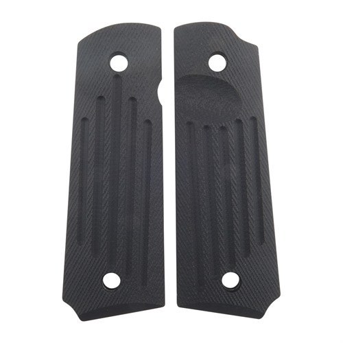 Durable machined G10 fiberglass grips are almost impervious to solvents, moisture, and expansion/contraction due to temperature extremes. Five, deep, vertical grooves in each panel and fine-line diagonal texturing help you retain a solid grip on the pistol but won’t snag like traditional checkering. Still allows a quick shift of grip for reloads, and also easier on clothes and your skin during carry.