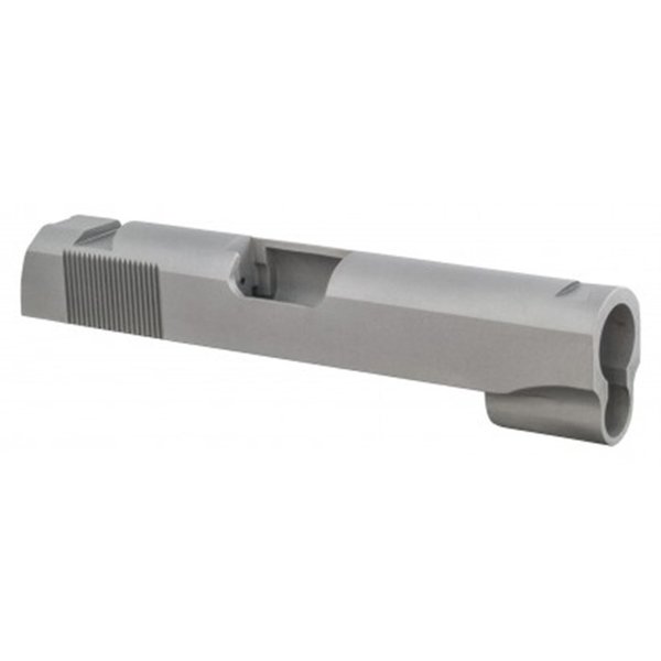 1911 Slide, Fusion Diamond Series Commander Slide. Combat GI Colt Style. Comes completely machined for 45acp caliber barrels. This slide is precision CNC machined from 4140 Bar-Stock and heat treated. Featuring GI/Mil spec rear serrations and standard dovetail Rear: .495 x 65 degree, Front: .330 x 65 degree sight cuts. These slides are supplied "in the white", matte finish and oil dipped. The firing pin holes on all diamond series slides and top ends are reamed to take the 9mm / 38 super firing pin, as with all high grade slides. This slide has the 45 ACP breech face cut so it will work with all of the 45 cartridge group (45 ACP, 45 Super, 400 Corbon, 460 , etc.)