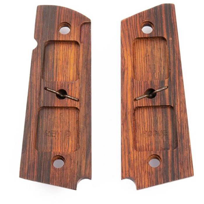 - Umístěte nové rukojeti Cocobolo na rám zbraně, zarovnejte je s otvory pro šrouby.