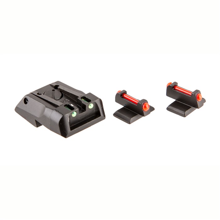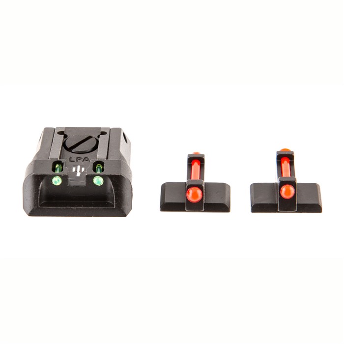 Fusion Firearms / LPA Fully adjustable Dovetail style sight set in Fiber Optic configuration. This rear sight is designed in the "low profile" configuration for easy holstering and makes for a great Target, Combat, or Concealment Sight. It is a great replacement sight, allowing you to fine tune the "Point of Impact" (POI) to your liking. They are manufactured with precision machined components for fine and positive click adjustments and are fully adjustable for windage and elevation. The dovetail rear sight bases have locking screws which allow for secure retention in the slide dovetail. The rear sight dovetail is the standard .495 x 65 degree and the front dovetail is the standard .330 x 65 degree cuts. These sights are available in Black, White Dot, and Fiber Optic configurations. These are a direct replacement sights for the popular novak sight cuts used on most modern 1911 style pistols and many others. Comes complete with flat front and rear sight, ready to install.