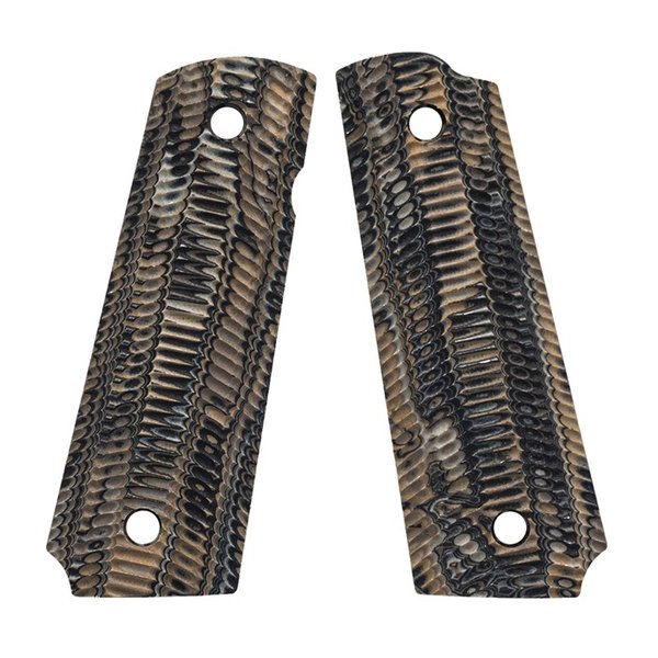 Inspired by the original Gator Back VZ 1911 Alien® grips were originally designed for the Precision Weapons Section of the U.S. Marine Corps, but quickly became a favorite as soon as they were offered to retail customers. These grips offer a great blend of form and function, proving a decent amount of bite without being too harsh while looking good on modern and classic 1911s alike. Great for concealed carry, target practice, or even safe queens. Designed to fit all of the most popular full-size (Government or Commander) 1911 models from Colt®, Springfield Armory®, Kimber®, Rock Island Armory®, Dan Wesson Firearms®, and many more. Cut for ambidxtrous safeties Frame: Full Size 1911 Weight: 2.19oz - 62.0g (approximate) Material: G-10 or Micarta Aggressiveness: 2 out of 5