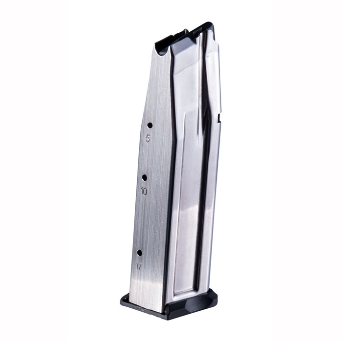 Complete, high capacity magazines. TIG welded, heat-treated, stainless steel bodies hold up to competition use without cracking or failure. All springs are tempered music wire, and fit STI bodies without trimming. Complete mags come with Polymer base pad and nylon follower for flawless feeding.