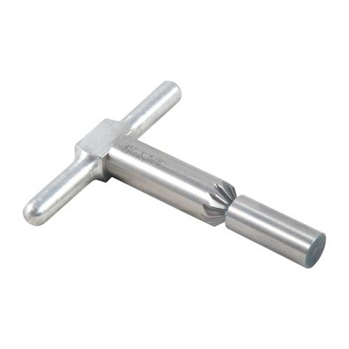 45° chamfering cutter odstraňuje hrany drážkování pro hladký výstup střely nebo upravuje ústa komor revolverového válce pro rychlé přebíjení. Obsahuje cutter, rukojeť a jeden pilot, vše uložené v polypropylenové krabici. Vyměnitelný pilot udržuje cutter správně zarovnaný. Zakupte si další piloty, abyste mohli použít jeden cutter pro různé ráže. Piloty pro jiné ráže jsou k dispozici samostatně.