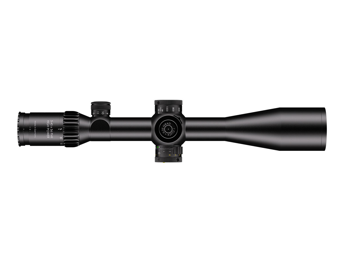 4060537047110 The 5–45×56 PM II High Power is a professional‑grade precision optic that merges a high‑performance riflescope with spotting‑scope capability. Designed for observation and ultra‑long‑range engagement, its enormous 9× zoom range (5–45×) makes it equally at home on reconnaissance, match, or tactical platforms where both identification and shot‑making accuracy are required. Engineered for extreme clarity and reach, the 56 mm objective delivers excellent light gathering while the optical system maintains a large usable field of view across the entire zoom range — allowing fast situational awareness at low magnification and razor‑sharp detail at high power. The reticle sits in the first focal plane, so hold‑offs and subtensions remain precise at any magnification. The model features robust, lockable turrets with fine 0.1 mrad click values and very large usable internal adjustment ranges tailored for extreme‑range correction. Built on a rugged 34 mm main tube, the High Power is constructed for demanding environments: it is fully weatherproof, fogproof and shock‑resistant. Despite its long reach, the design balances mechanical strength with practical ergonomics for field use. Standout Features Exceptional 5–45× magnification range for combined observation and precision shooting Large 56 mm objective for outstanding light transmission and image resolution First focal plane reticle for accurate ranging and holdover at any magnification Precision turrets with 0.1 mrad click value and extensive elevation/windage adjustment range Side/parallax adjustment for crisp focus from mid‑range to extreme distances High optical transmission (~90%) and illuminated reticle options for low‑light operations Robust 34 mm tube, weatherproof and built for professional use Key Specifications Magnification: 5–45× Objective diameter: 56 mm Main tube diameter: 34 mm Field of view: approx. 7.8–0.9 m @ 100 m Exit pupil: approx. 8.8–1.2 mm Eye relief: 90 mm Length: approx. 434 mm Weight: approx. 1,130 g Reticle: FFP (various tactical reticle options) Click value: 0.1 mrad Elevation adjustment range: ~27 mrad (internal ~29.6 mrad) Windage adjustment range: ±6 mrad (internal ~21.1 mrad) Parallax: adjustable Illumination levels: multiple (illuminated reticle available) Optical transmission: ~90% Designed and manufactured to professional standards, the 5–45×56 PM II High Power is the go‑to optic for operators and precision shooters who require unmatched versatility, extreme reach and uncompromising optical and mechanical performance.