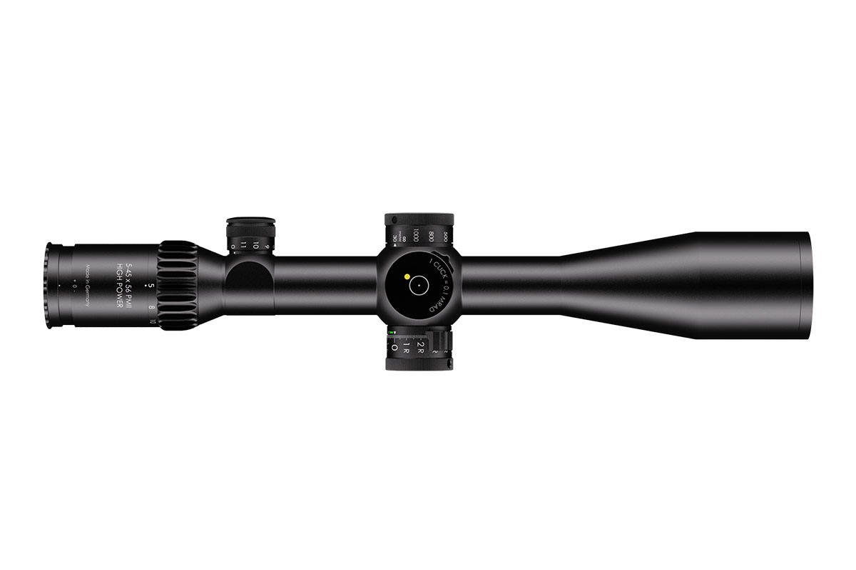 4060537036671 The 5–45×56 PM II High Power is a professional‑grade precision optic that merges a high‑performance riflescope with spotting‑scope capability. Designed for observation and ultra‑long‑range engagement, its enormous 9× zoom range (5–45×) makes it equally at home on reconnaissance, match, or tactical platforms where both identification and shot‑making accuracy are required. Engineered for extreme clarity and reach, the 56 mm objective delivers excellent light gathering while the optical system maintains a large usable field of view across the entire zoom range — allowing fast situational awareness at low magnification and razor‑sharp detail at high power. The reticle sits in the first focal plane, so hold‑offs and subtensions remain precise at any magnification. The model features robust, lockable turrets with fine 0.1 mrad click values and very large usable internal adjustment ranges tailored for extreme‑range correction. Built on a rugged 34 mm main tube, the High Power is constructed for demanding environments: it is fully weatherproof, fogproof and shock‑resistant. Despite its long reach, the design balances mechanical strength with practical ergonomics for field use. Standout Features Exceptional 5–45× magnification range for combined observation and precision shooting Large 56 mm objective for outstanding light transmission and image resolution First focal plane reticle for accurate ranging and holdover at any magnification Precision turrets with 0.1 mrad click value and extensive elevation/windage adjustment range Side/parallax adjustment for crisp focus from mid‑range to extreme distances High optical transmission (~90%) and illuminated reticle options for low‑light operations Robust 34 mm tube, weatherproof and built for professional use Key Specifications Magnification: 5–45× Objective diameter: 56 mm Main tube diameter: 34 mm Field of view: approx. 7.8–0.9 m @ 100 m Exit pupil: approx. 8.8–1.2 mm Eye relief: 90 mm Length: approx. 434 mm Weight: approx. 1,130 g Reticle: FFP (various tactical reticle options) Click value: 0.1 mrad Elevation adjustment range: ~27 mrad (internal ~29.6 mrad) Windage adjustment range: ±6 mrad (internal ~21.1 mrad) Parallax: adjustable Illumination levels: multiple (illuminated reticle available) Optical transmission: ~90% Designed and manufactured to professional standards, the 5–45×56 PM II High Power is the go‑to optic for operators and precision shooters who require unmatched versatility, extreme reach and uncompromising optical and mechanical performance.