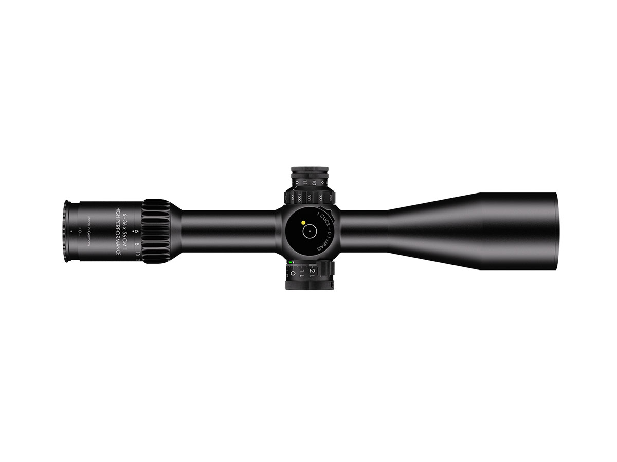 4060537070460 The 6‑36×56 CM II High Performance from Schmidt and Bender is a high-end precision riflescope engineered for medium to extreme long-range engagement. With a magnification range of 6–36× and a large 56 mm objective lens, it delivers outstanding clarity, resolution, and flexibility across demanding shooting scenarios. Its optical design provides an exceptionally large field of view for a scope in this class — even at the lowest magnification (6×), it outperforms many 5–25× scopes in terms of visual coverage. Advanced coatings ensure light transmission well over 90 %, enabling superb image brightness and contrast in challenging lighting conditions. Built on a 34 mm main tube, the scope is compact yet robust, with a length of approximately 390 mm and weight around 940 to 995 g, depending on configuration. Eye relief is generous at 90 mm, ensuring comfortable and safe use across rifle platforms. The turret system offers very large internal adjustment ranges (over 40 mrad, approx. 395 cm elevation at 100 m) and fine click values (e.g., 0.5 cm/100 m), making it well suited for precision ballistic correction at long distances. Side parallax adjustment and the integrated LPI system (illumination integrated into the parallax knob) enhance ease of use and compatibility for left-hand shooters. Key Specifications: Magnification: 6–36× Objective Lens Diameter: 56 mm Main Tube Diameter: 34 mm Field of View (approx.): 7.3–1.3 m @100 m Exit Pupil: approx. 8.3–1.6 mm Eye Relief: 90 mm Click Value: approx. 0.5 cm @100 m (configuration-dependent) Internal Elevation Adjustment: approx. 395 cm @100 m Weight: approx. 940–995 g Transmission: >90 % Tube Diameter: 34 mm Length: approx. 390 mm Reticle and Turret Configurations: Various high-end match/tactical setups available This scope is designed for marksmen, competition shooters, and professionals who demand the highest optical clarity, mechanical robustness, and long-range capability from one flagship optic.