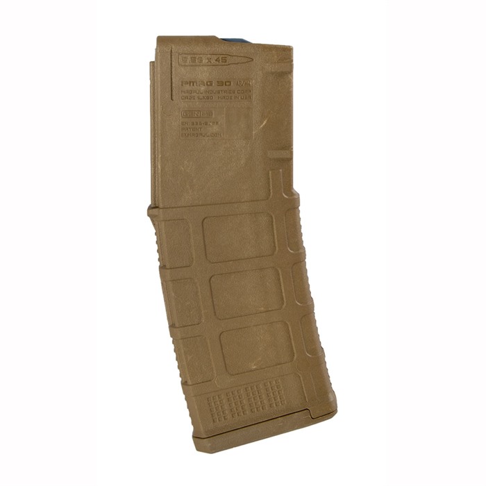 The next-generation PMAG AR/M4 GEN M3 is a 30-round polymer magazine for AR15/M4 compatible weapons chambered in 5.56x45 NATO / .223 Remington. Along with expanded feature set and compatibility, the GEN M3 incorporates new material technology and manufacturing processes for enhanced strength, durability, and reliability that exceed rigorous military performance specifications. While the GEN M3 is optimized for Colt-spec AR15/M4 platforms, modified internal and external geometry also permits operation with a range of additional weapons, such as the HK® 416/MR556A1/M27 IAR, British SA-80, FN® SCAR™ MK 16/16S, and others. Similar to the MOE® PMAG, the GEN M3 features a long-life USGI-spec stainless steel spring for commonality, a four-way anti-tilt follower, constant-curve internal geometry for reliable feeding, and simple tool-less disassembly for easy cleaning. The PMAG GEN M3 also includes a redesigned bolt catch notch in the rear of the magazine that provides increased bolt catch clearance, while an over-travel stop on the spine helps ensure the magazine will not over-insert on compatible weapons. Low profile ribs and new, aggressive front and rear texture give positive control of the GEN M3 in all environments, and a paint pen dot matrix has been added to the bottom panel of the body to allow easy marking for identification. The new, easy to disassemble flared floorplate aids extraction and handling of the magazine while providing improved drop protection, but is slightly slimmer than before for better compatibility with tight double and triple magazine pouches. FEATURES 30 or 40-round reliability with no stoppages Easy Identification - Use the paint pen dot matrix to easily identify your different loads when it's crunch time Advanced follower- The anti-tilt, self-lubricating follower ensures a smooth feed and magazine reliability Slimline floorplate - Improved flared floorplate aids magazine handling and disassembly and is slim enough for use with many double and triple pouches Next-generation impact and crush-resistant polymer construction that includes constant-curve internal geometry for smooth feeding Modified dimensions allow for wider compatibility with non Colt-spec 'STANAG 4179' platforms Constant-curve internal geometry, over-travel insertion stop on the spine, and a long-life stainless steel spring ensure smooth feeding Made in the USA. SPECS Caliber: 5.56x45mm / .223 Remington Platform: AR15, M4, M16, SA-80 Capacity: 30 or 40 Rounds depending on magazine Weight: 5 oz. Length, max: 7.5 in. Compatibility: Wide compatibility with most 'STANAG 4179' platforms such as the AR15, M4, M16, SCAR MK16/16S, HK416, MR556, M27 IAR, IWI Tavor, and others