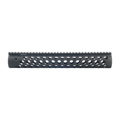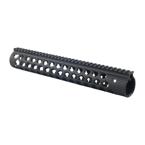 Ručka z obráběného hliníku s volným plovoucím designem využívá jedinečný systém matice hlavně a rotačního zámku, který zajišťuje správné zarovnání horní lišty s lištou přijímače. Ručka se nasazuje na hlaveň a plynovou trubku pod úhlem, dokud se drážkovaná matice hlavně nezarovná v interním drážkovaném kanálu pro bezpečné uchycení. Dva šrouby s hex hlavou zajišťují ručku na místě a integrovaná zarážka zabraňuje přetažení.