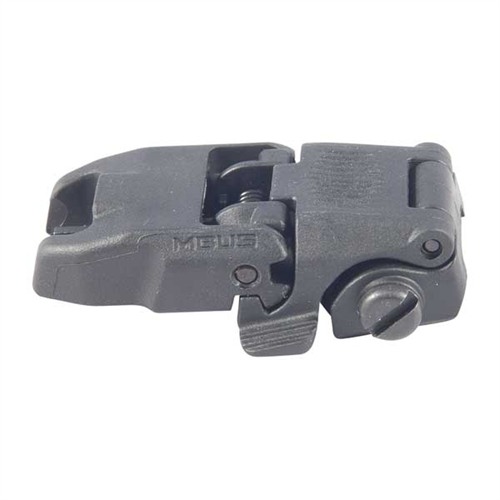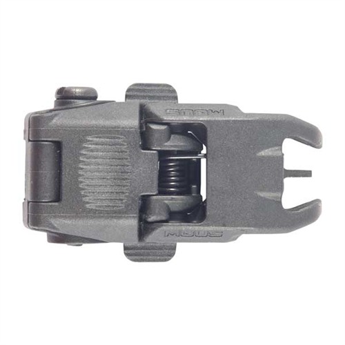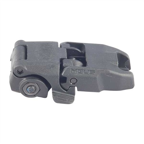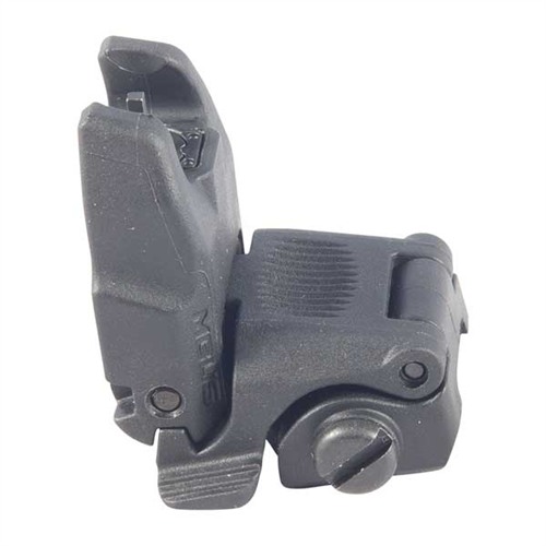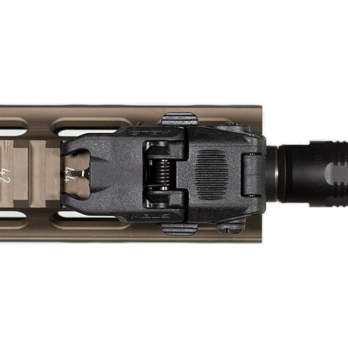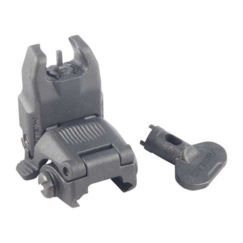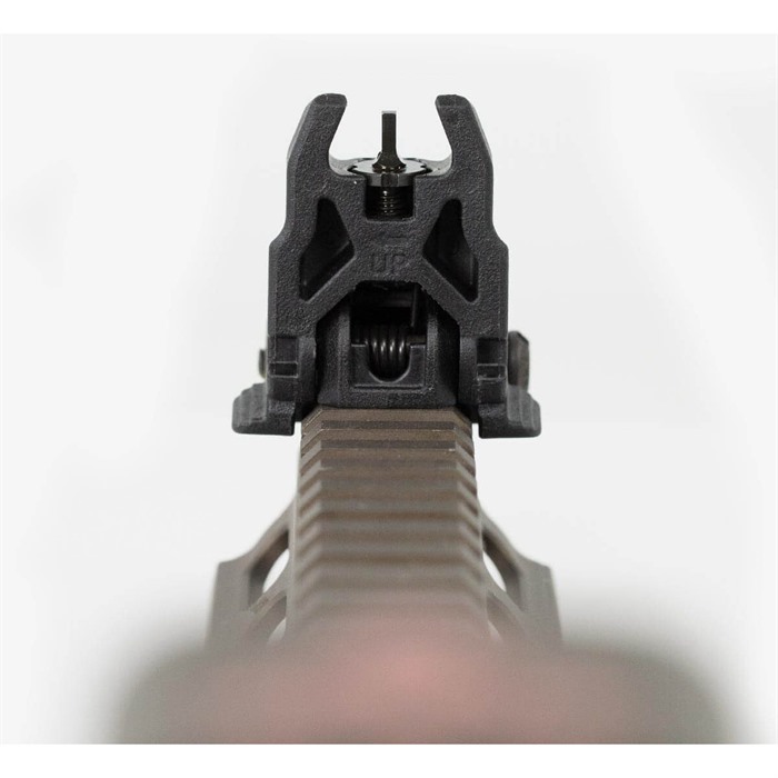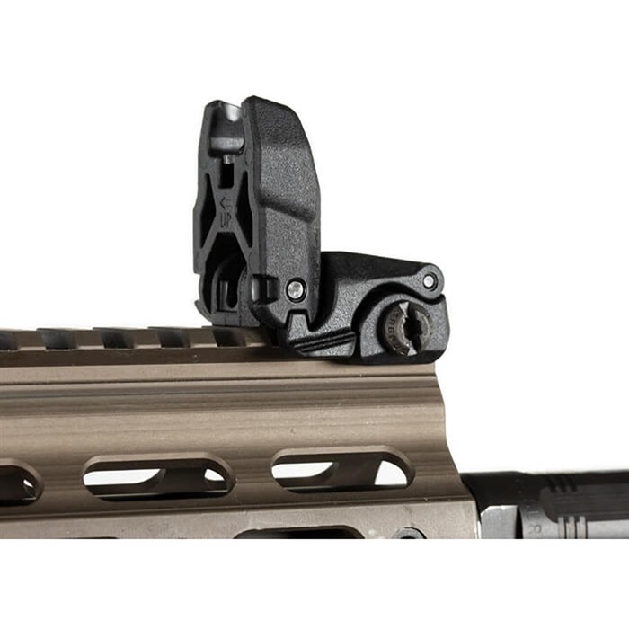 Low-profile, flattop-mounted, polymer sights deploy instantly at the touch of a finger to provide backup sighting if a primary optic fails. Streamlined contours mean there’s nothing to snag on brush, sling, or other gear when folded. Spring-loaded ambidextrous release mechanism lets you hit the grooved tab on either side of the sight to deploy, and lock it in place. Hitting the same tabs retract the sight when you're done. Uses less than 1" of MIL-STD 1913 Picatinny receiver rail space and locks securely in place with the included steel crossbolt. Provides the same height over bore as standard A2 iron sights. Front sight must be mounted on a railed forend on the same plane as the receiver rail to witness correctly with rear sight. Not compatible with railed gas blocks or the MOE handguard.