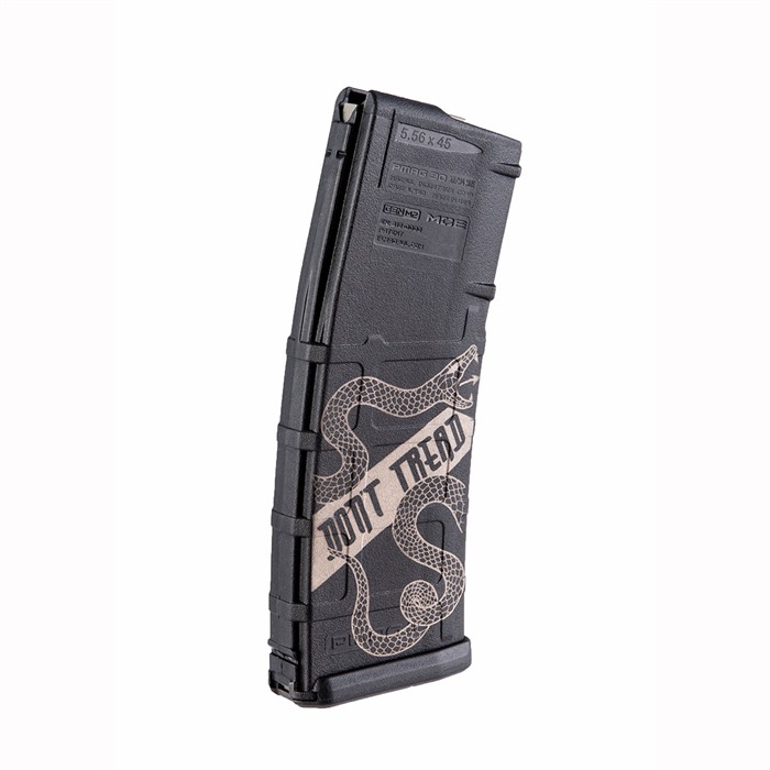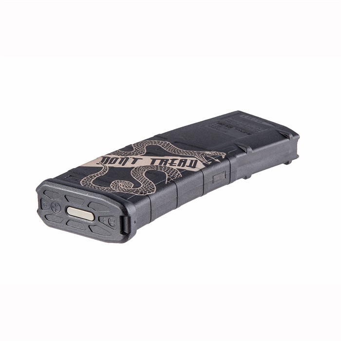 Exercise Both Your 1st & 2nd Amendment Rights With These Unique 30-Rd Mags Magazines are utilitarian devices - you need 'em so you can load rounds into your rifle or pistol and send them downrange, preferably in large numbers. Our AR-15 Specialty Magazines are a lot more fun than their name suggests. These are standard Magpul PMAG Gen M2 MOE 30-round mags with slightly edgy graphics permanently laser-engraved on them. Choose from the American classic ""Don't Tread"" entwined by a fierce-looking snake (a reference to the Revolutionary War Gadsden flag), the defiant ""COME AND TAKE IT!"" (used during both the Revolution and the Texas Revolution of 1836), and a simple, practical Fuel Gauge graphic on a PMAG Gen M3 Window mag. Because the designs are laser-engraved and not painted, they are highly resistant to wear and cleaning solvents. However you deploy these specialty mags, one thing is for sure: you can count on their steady, rock-solid, unfailing reliability because they're built by Magpul. We just added the whimsical graphics because.... why does your AR-15 magazine have to look just like every other AR-15 mag on the range?
