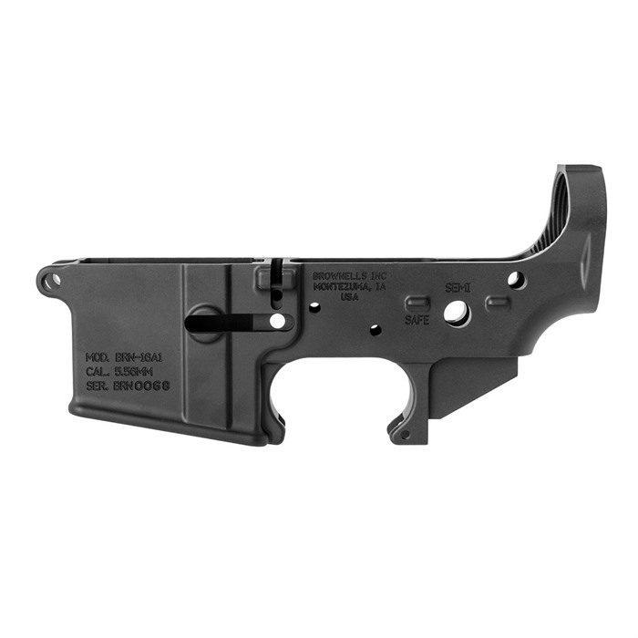 Designed in conjunction with Nodak Spud, the BRN-16A1 Lower Receiver matches the features of the original M16A1 Receiver. Perfect for a “Retro” or reproduction build, these lowers precisely mirror the original profile. Features specific to the BRN-16A1 Lower Receiver are the proper M16A1 front takedown lug profile, and profile surrounding the receiver extension. Most forged lower receivers produced today feature “A2” profiles, which are incorrect for M16A1 reproduction builds. The lower starts off as a 7075 T6 aluminum forging, then is machined to mil-spec dimensions. Once machined, the lower is finished with a matte black hard anodized finish. This finish matches modern uppers found on the market today, as well as the Brownells M16A1 Upper Receiver sold separately. Standard AR-15 components will work perfectly with this lower. Simple, engraved markings on the lower include: Model: BRN-16A1 Cal: 5.56mm Mfg: Brownells Inc This lower is the proper receiver for the following reproduction builds: M16A1 Model 619 Model 629 Model 630 / GAU-5A Model 639 Model 649 / GAU-5A/A Model 651/652 Model 653/654 Mk 18 Mod 0 Mk 12