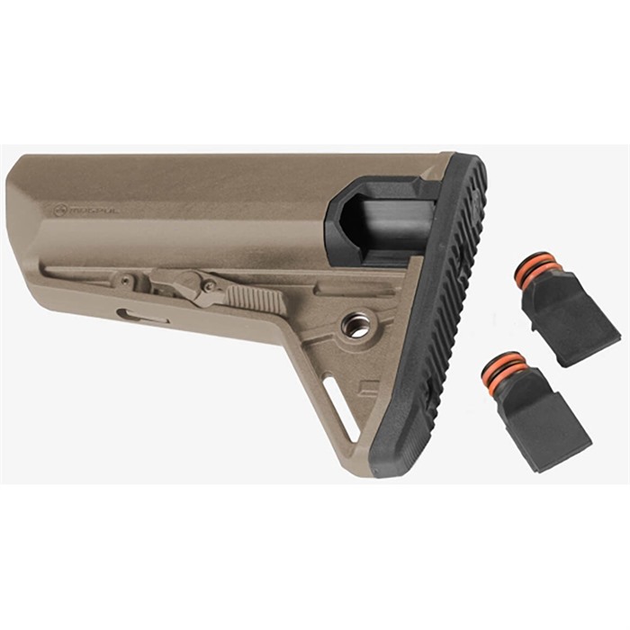The storage-capable version of the flagship Magpul MOE SL™ carbine stock, the MOE SL-S (Storage) Stock is a direct replacement buttstock for AR15/M4 carbines. The sleek profile, dual-side release latches, and waterproof battery tubes make it the slimmest storage tube stock available. The SL-S provides an enhanced cheek weld and true, O-ring sealed, 10m waterproof battery storage, but fits it into the narrowest package possible to allow a more upright head position and minimize bulk. A rolled toe and angled rubber butt-pad are optimized for use with body armor, and an ambidextrous QD sling swivel socket is included. A unique leaf-spring tension system provides a solid fit on mil-spec receiver extensions, with slightly less friction than the original SL.