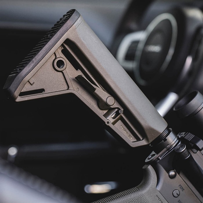 - Pro nastavení LOP stiskněte západku a posuňte pažbu na požadovanou délku.