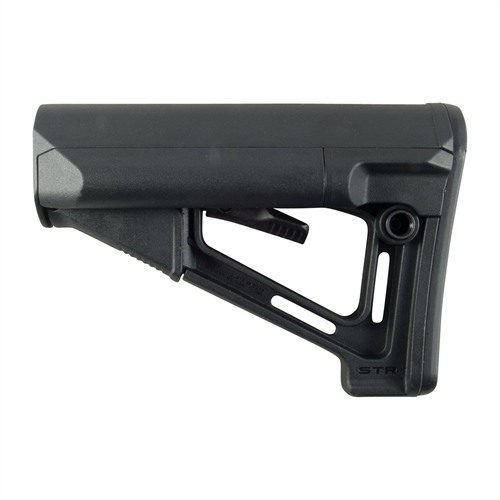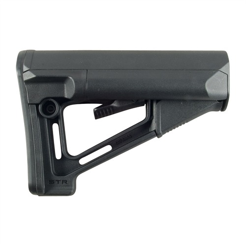 An enhanced version of the Magpul CTR® stock, the STR (“Storage/Type Restricted”) buttstock features two 4¼" left- and right-side positioned battery storage tubes and a wider cheekweld for extra comfort. Rubber caps at the rear keep the storage compartments resistant to water incursion, yet pop off easily for access to two AA or two CR-123 batteries inside. Features two integral 1¼" sling loops. Includes reversible QD swivel socket. Friction locking mechanism minimizes wobble between the buffer tube and the buttstock for a solid, secure "feel", which is enhanced by the detachable .30" thick rubber rubber that adds plenty of "grab" to prevent shoulder slippage.