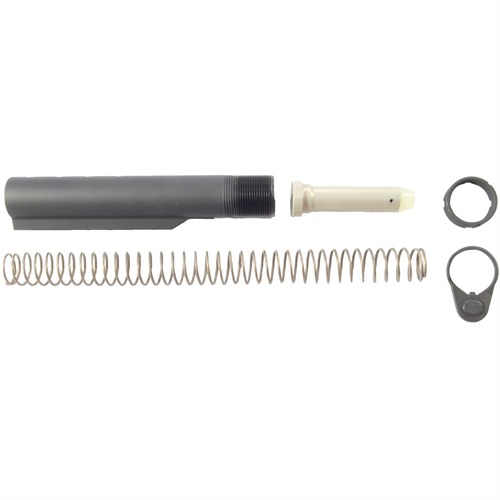- Zkontrolujte, zda máte všechny potřebné komponenty: rozšiřující trubku, A2 spacer, recoil buffer, pružinu, zajišťovací kroužek a desku přijímače.