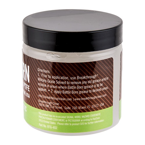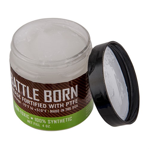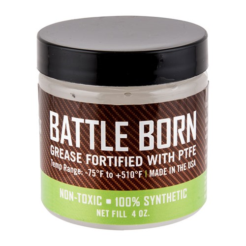 BATTLE BORN GREASE je čisté, univerzální a prémiové mazivo s nízkou viskozitou, obohacené o submikronový PTFE, které zajišťuje hladký chod pohyblivých částí zbraní. Toto mazivo je kompletně smícháno s čistými syntetickými základovými oleji, přísadami a stabilními zahušťovadly, aby poskytovalo maximální ochranu v extrémních provozních teplotách (-75 °F až +510 °F).