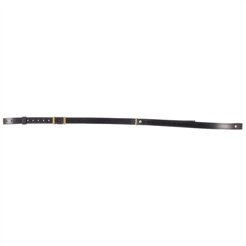 SPECS: Leather, black, with brass hardware. 44" (112cm) long x 1" (2.5cm) or 1¼" (3.2cm) wide. Ching Specialty also available in chestnut brown, includes center strap, 9" (23cm) long. Sling swivels not included.