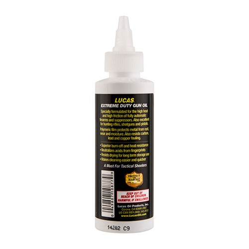 Lucas Extreme Duty Gun Oil byl navržen pro plně automatické zbraně, SBR a tlumiče, stejně jako pro poloautomatické pušky, brokovnice a pistole. Nabízí vynikající odolnost vůči spálení, nárazům a teplu, což ho odlišuje od ostatních víceúčelových olejů na zbraně.