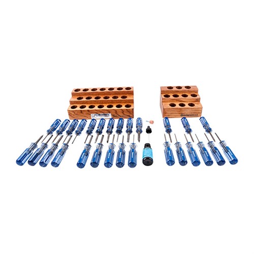 Šroubováky jsme zabalili dvěma způsoby: Master Set™ obsahuje všech 20 šroubováků, plus správně zaoblený Bit Shaping Stone, Bench Block a láhev Brownells Best Penetrating Oil™. Abychom vytvořili Super Master Set™, vzali jsme Master Set a přidali 6 šroubováků s Allen hlavou, 3 Phillips "Anti-Cam" šroubováky a Add-On Block. Stejně jako u všech našich nástrojů a potřeb, jsou zaručeny, že vás potěší, nejvíce náročného řemeslníka na světě - pracujícího zbrojíře.