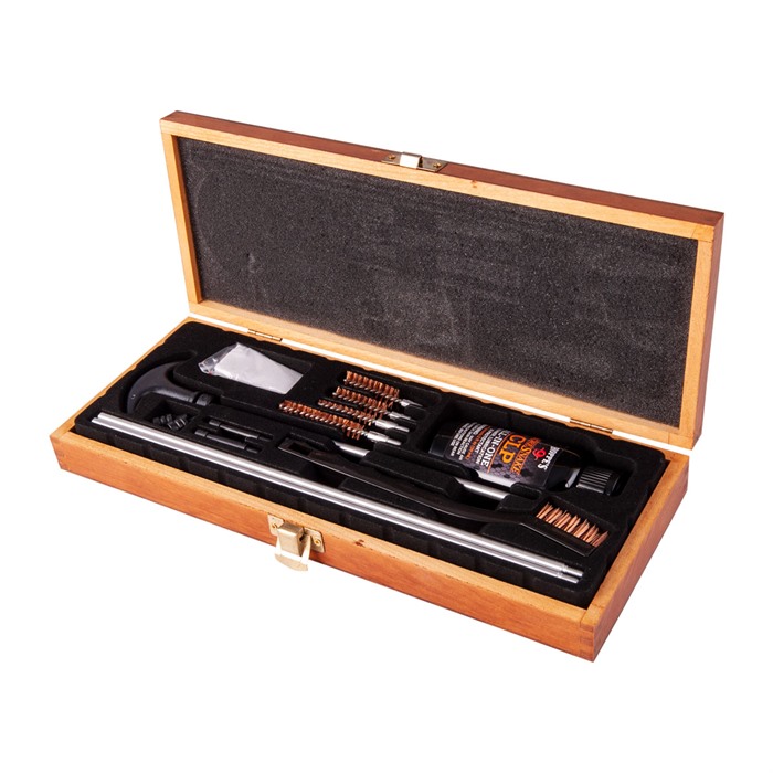 This new Wood Box Cleaning Kit makes cleaning a firearm a simple task with Hoppe's Boresnake CLP and included cleaning tools. The three-piece aluminum cleaning rod has a ball bearing swivel handle that follows the rifling in a gun bore for easy cleaning when used with one of the four bronze brushes, four nylon jags, and patches. Use the bronze cleaning brush to clean any stubborn fouling. When the cleaning is complete, keep all the cleaning accessories organized in the wood storage box. Wood storage box Hoppe's Boresnake CLP, 2oz Three-piece aluminum cleaning rod Bronze cleaning brush .22, .30, .9mm, .40/.45 cal bronze brushes .22, .30, .9mm, .40/.45 cal nylon jags Patches