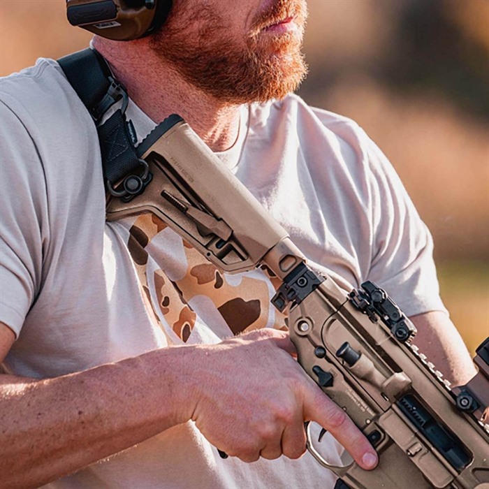The MOE SL-M Carbine Stock – Mil-Spec is a drop-in replacement buttstock for AR15/M4 Mil-Spec carbine buffer tubes. It was specifically developed for ultra-compact, PDW-style military platform requirements and for users desiring a smaller, lighter stock. Similar to the SL-K, the SL-M features a shorter and slimmer profile that is optimized for PDW-length receiver extensions. With its small, non-slip rubber butt-pad and an angled toe, the SL-M was engineered to support shoulder transitions, even while wearing body armor and modular gear. It includes a unique, ambidextrous release latch that is shielded to prevent accidental deployment and minimizes rattle on the receiver extension without requiring additional locks, levers, or springs. The 1.25" footman's loop accepts an optional M-LOK® QD Sling Mount for push-button style QD sling swivels. Made in the USA. Internal release latch feature mitigates rattle and wobble Ambidextrous shielded adjustment lever Angled toe for easy shouldering Non-slip rubber butt-pad Reinforced polymer construction 1.25” ambidextrous sling loop Accepts M-LOK QD Sling Mount for QD sling swivel capability