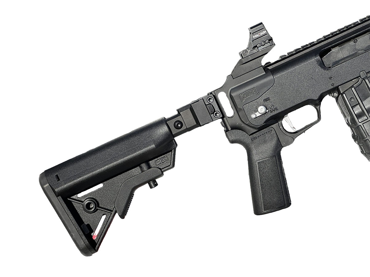 The Chisel Machining Mossberg 590R Folder is a premium, CNC-machined folding stock designed specifically for the Mossberg 590R platform. Built for durability, modularity, and compact handling, this stock is ideal for users who demand both rugged performance and refined engineering. Machined from solid 6061 billet aluminum, the 590R Folder offers exceptional strength while maintaining a balanced weight profile. The side-folding mechanism allows the stock to fold neatly, significantly reducing overall length for easier transport, storage, and maneuverability in confined spaces. The stock features an adjustable length of pull, enabling shooters to fine-tune the fit for optimal comfort and control. Its design supports compatibility with AR-style grips and other tactical components, making it a versatile upgrade for professional, tactical, or enthusiast use. Finished with precision CNC detailing and a durable surface treatment, the Chisel Machining 590R Folder delivers both a high-end appearance and dependable performance under demanding conditions. Key Features CNC-machined from 6061 billet aluminum Side-folding stock for compact transport and storage Adjustable length of pull for a customized fit Designed specifically for the Mossberg 590R Compatible with AR-style grips and tactical setups Precision machining with a durable, professional finishPřeobjednávka, dodací lhůta je přibližně 3-4 měsíců z evropského skladu.