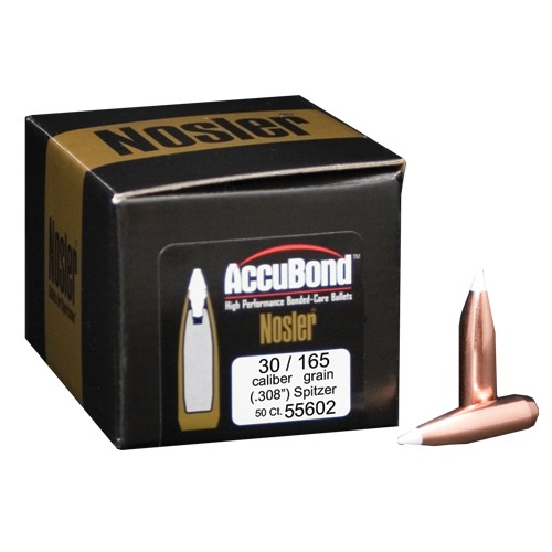 NOSLER ACCUBOND® 30 CALIBER (0.308") SPITZER BOAT TAIL RIFLE BULLETS jsou navrženy tak, aby poskytovaly maximální výkon a spolehlivost na jakoukoli vzdálenost. Díky unikátnímu procesu spojování, který eliminuje prázdná místa v jádru střely, spojují AccuBond® střely osvědčený měděno-slitinový plášť Nosler s olověným jádrem, což vede k smrtelně pronikající střele, která se rovnoměrně rozšiřuje při nárazu.
