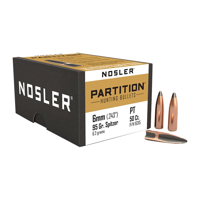 NOSLER® PARTITION 6MM (0.243”) FLAT BASE SPITZER RIFLE BULLETS jsou základním kamenem pro lovecké náboje, na kterém byla celá společnost Nosler založena. Tyto náboje jsou navrženy tak, aby expanze a přenos masivního šoku a energie byly maximální, zatímco oddělená část zajišťuje maximální udržení hmotnosti.