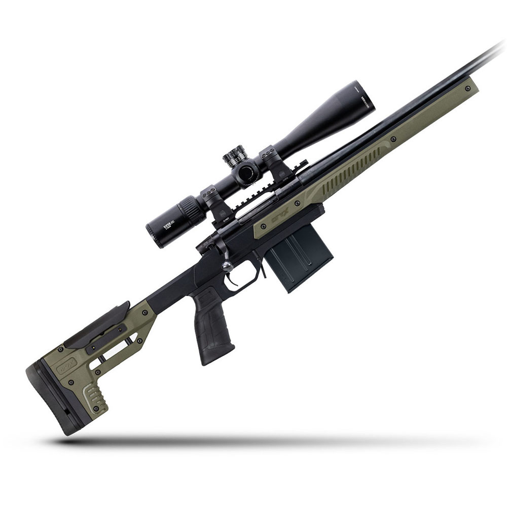 It takes AR15 grips, ARCA rails, M-Lok accessories and has customizable colors. It's designed as an excellent upgrade for shooting matches, hog or coyote hunting, or anyone interested in getting into long-range shooting.