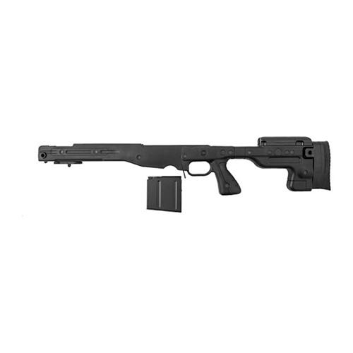 The AT chassis from Accuracy International is a polymer and alloy chassis (not merely a stock), which provides the rigidity, strength and durability necessary to provide a stable, rugged platform for the barreled action in all weather and any terrain. Adjustable length of pull using 10mm and 20mm spacers. Lateral and height adjustable cheek piece. Six flush cup sling points for quick sling positioning. Optional AT folding stock using AI’s battle proven hinge system. AX chassis style pistol grip. AICS 5 round magazine included and optional 10 round magazines available. KeySlot™ accessory mounting system on the 6:00 O’clock forend surface.