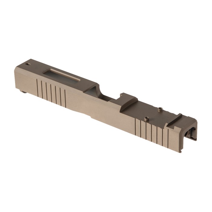 Our RMR Slide for Glock® 17 Gen3 pistols features distinctive, wraparound front cocking serrations that aid in manipulating the slide to check the chamber or clear a jam. (OK, we’ll admit it: the serrations just look cool, too.) It also comes with a pre-cut slot for easy, secure mounting of a Trijicon RMR or Holosun red dot sight. All RMR Slides also have standard Glock® factory front and rear sight dovetails for "iron" backup sights. To get proper co-witnessing with the RMR, you will need to also install suppressor-height iron sights. You can also get your Brownells RMR Slide for Glock® 17 Gen3 with a "window" cutout on top that enhances airflow to keep the barrel cool - ideal for hard-working action competition pistols. Plus, if you have an upgraded barrel with a contrasting finish or a unique exterior pattern (fluting, spirals, "flames," etc.) the window lets you show it off a bit! Each RMR Slide for Glock® starts life as a billet of 17-4 stainless steel that is machined to Glock® factory specifications inside, so it’ll fit factory frames and accept factory or aftermarket barrels and Gen3 internal parts. Slides are heat-treated to Rc 41-44 on the Rockwell C scale for added surface hardness and wear resistance. You can get your RMR slide in one of 3 finishes: a wear-resistant basic Black Nitride, or a thin, extremely tough, physical vapor deposition (PVD) coating in Bronze or Flat Dark Earth (FDE). Fits Gen3 Glock® 17 pistols & clones Machined from corrosion-resistant 17-4 stainless steel billet Trijicon RMR mounting slot Also accepts Holosun HE508T, HS507C & HS407C red dot sights Plus factory front/rear sight cuts Available with distinctive top Window cutout or traditional Solid top A Brownells RMR Slide is the ideal upgrade for your factory Glock® 17 Gen3 pistol OR the perfect "top half" for a brand-new custom gun built on a Polymer80 80% frame. Brownells Gun Tech™ Note: Channel liner required for these slides. Channel liner is a press fit and requires a tool to install. We recommend #777-100-017. Includes patented optic cut technology pioneered by ZEV Technologies. Patent No. RE47335