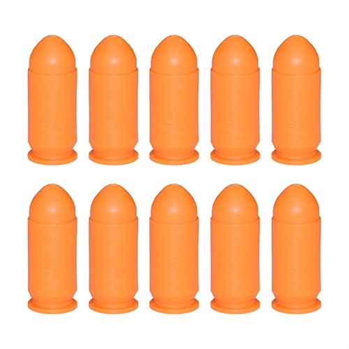 SAF-T-TRAINERS DUMMY ROUNDS, 45 AUTO ORANGE DUMMY ROUNDS 10/PACK jsou ideální volbou pro tréninkové cvičení. Tyto jasně zbarvené plastové náboje a jejich odlišný "pocit" zajistí, že je nikdy nebudete zaměňovat za živé náboje.