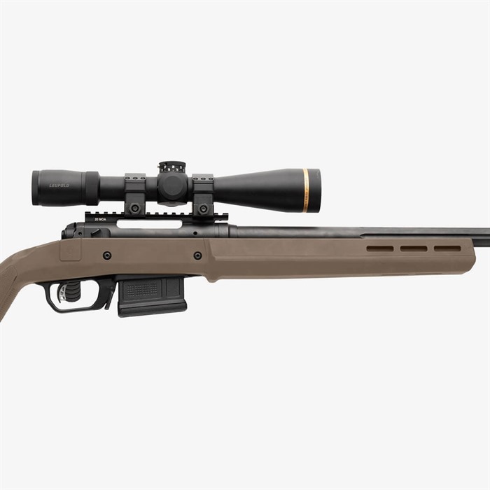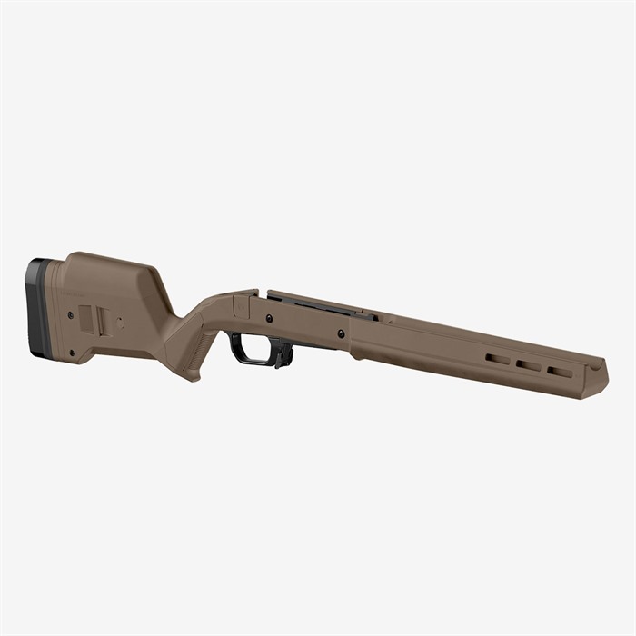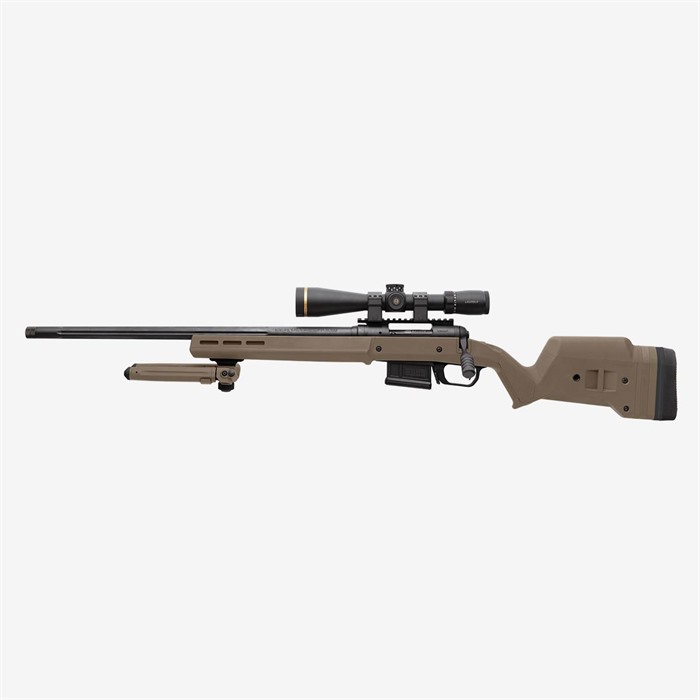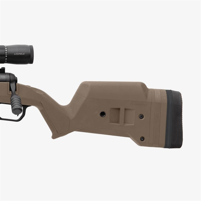 The Hunter 110 Stock – Savage 110 Short Action is the latest addition to the Magpul Hunter stock product line. It features enhanced ergonomics, versions for both right and left-hand actions, eight M-LOK® slots for mounting options, and a fully adjustable length of pull and comb height. These features have been optimally designed to provide a more stable shooting platform, improved user comfort and individual accessory customization. Like its predecessors, the Magpul Hunter 110 features a Type III hard anodized, machine-finished, cast aluminum bedding block that doesn’t require bedding and is a true “drop-in” stock solution. The Hunter 110 is designed for 3rd generation Savage short action Series 10/110 centerfire rifles that have center-feed magazine compatibility and action screw hole spacing of 4.40” (H-prefix and later) with production a date of 2006 and later. The Hunter 110 also includes Magpul’s Bolt Action Magazine Well for optimal functionality with AICS-spec detachable box magazines such as Magpul’s PMAG® 5 7.62 AC (sold separately). FEATURES Reinforced polymer shell with Type III hard anodized, machine finished, A380 cast aluminum V-bedding block. Available for right and left hand actions. Provides AICS-spec magazine compatibility for optimal performance and reliability (magazines sold separately) Made in the USA. SPECS Collection: Hunting Stocks Platform: Savage® 110 Butt-Pad Dimensions: 1.5 in W x 5.0 in H LOP Adjustment Range: 13.0 in, - 15.0 in. (13 in. with no spacers plus up to four half-inch spacers) Weight: 3.3 lbs. Width of Butt, max: 1.5 in. Width of Forend, max: 2.3 in. Compatible with 3rd generation Savage short action Series 10/110 centerfire rifles with center-feed magazine compatibility and action screw hole spacing of 4.40” that began in 2006. Compatible with barrel profiles up to Medium Palma and Savage Varmint barrel contours. Tapered Beam design provides rigidity through the forend and will free-float compatible barrels. Push-button QD swivel compatibility with optional Sling Mount Kits in rear of stock.