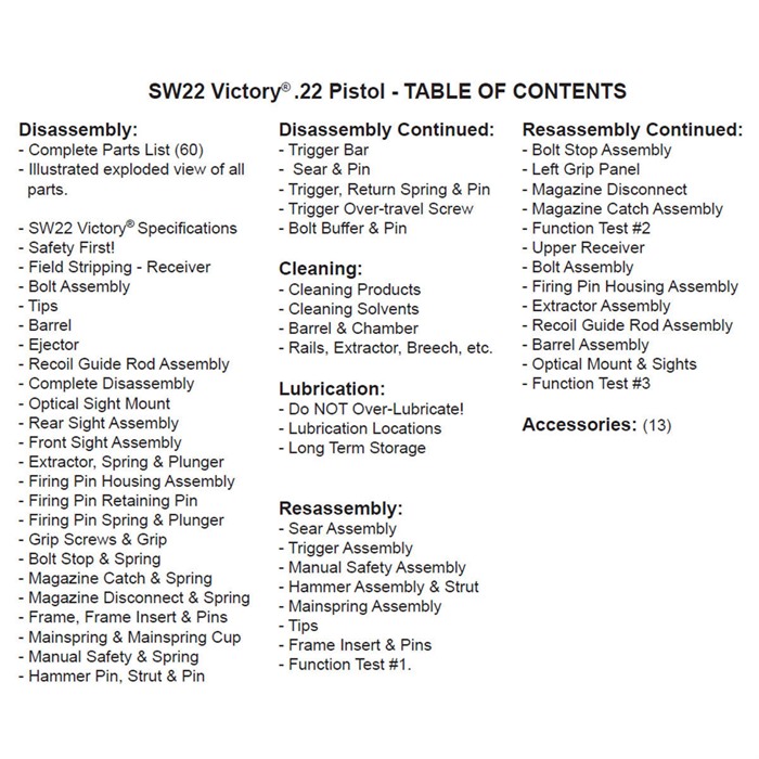Jedinečným prvkem průvodce pro montáž a demontáž Smith & Wesson SW22 Victory je zahrnutí několika insider tipů od profesionálů v oboru, které uživatelům pomohou udržovat jejich zbraň v provozu na střelnici.