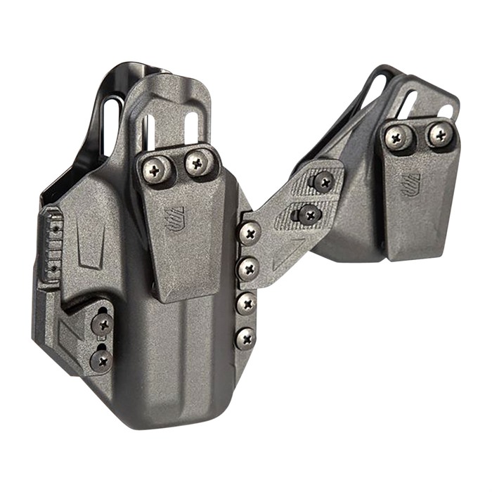 - Premium konfigurace: Obsahuje nastavitelné skryté drápky pro snížení viditelnosti, nastavitelného nosiče zásobníků do pásu s klipem a příslušenství pro spojení holsteru a nosiče zásobníků do platformy.