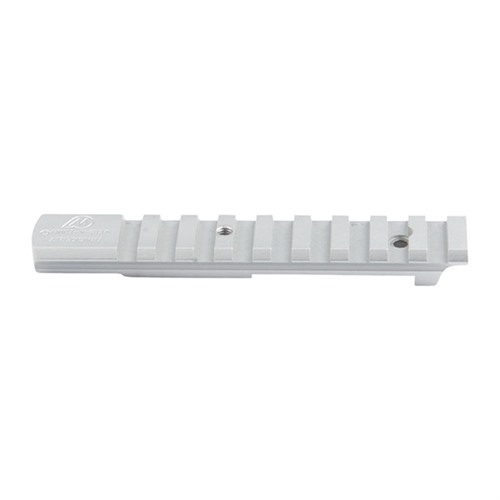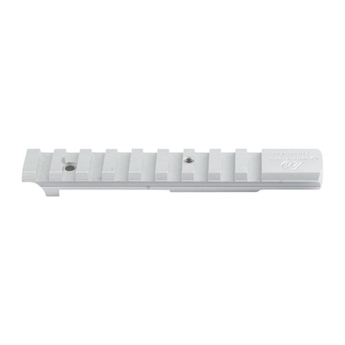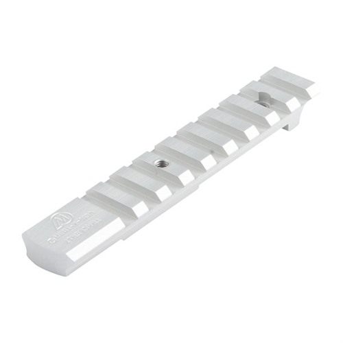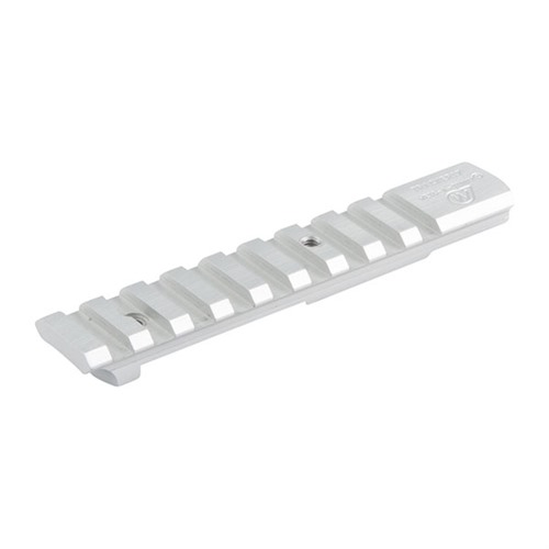 SPECS: Aluminum, silver, matte finish. 4½ (11.4cm) long, 5⁄16 (7.8mm) high from bottom to top of mount. 1.3 oz. (36.8g) weight. Includes mounting screws. Fits .22 LR, .22 Mag,, .17 HMR.