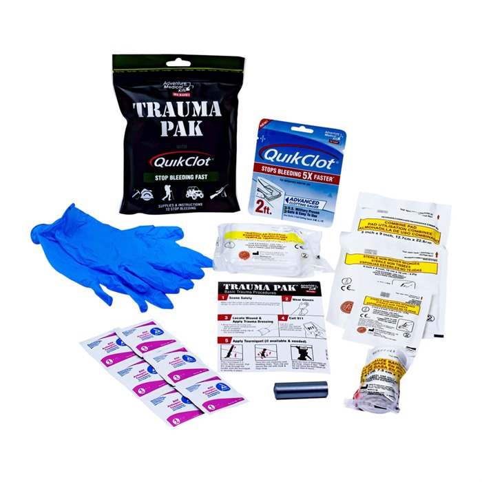 Tento trauma balíček obsahuje QuikClot, hemostatický obvaz, který zastavuje krvácení třikrát rychleji tím, že urychluje přirozený proces srážení krve vašeho těla pomocí zeolitu. Kromě hemostatického obvazu tento balíček zahrnuje: