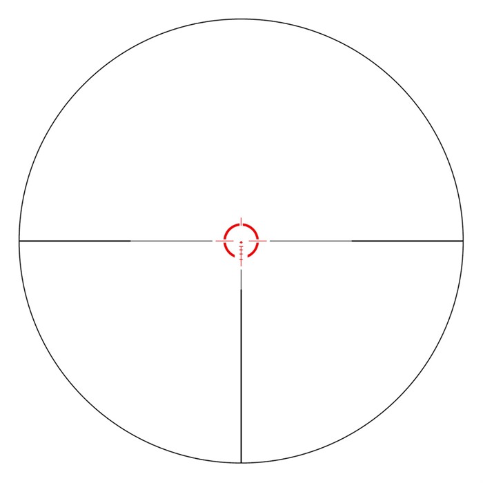 - Trident reticle: Ideální pro rychlé zaměření na blízké objekty a zároveň poskytuje možnost středně dlouhého dosahu s použitím 5.56/.308 BDC nebo MOA žebříčku.