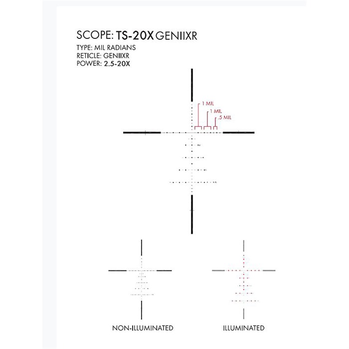 US Optics TS-20X je k dispozici se čtyřmi různými možnostmi záměrného kříže a disponuje osvětleným záměrným křížem, který poskytuje jasně vyznačený středový bod pro snadné míření za jakýchkoli světelných podmínek. Bez ohledu na to, který model si vyberete, všechny záměrné kříže TS-20X se nacházejí v první ohniskové rovině, takže víte, že vaše subtensiony v záměrném kříži jsou přesné při jakémkoli zvětšení.