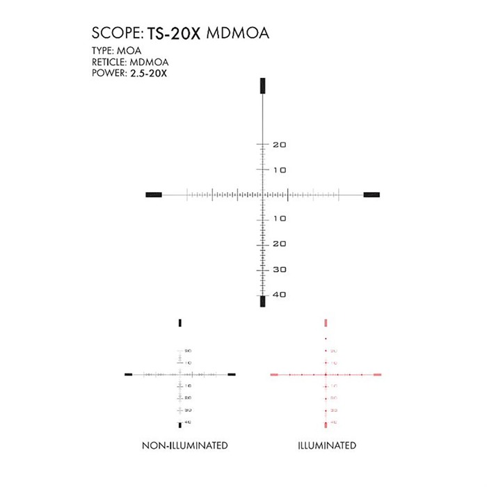 Available with four different reticle options, the US Optic TS-20X features an illuminated reticle that provides a clearly marked center dot for easy aiming in any lighting conditions. No matter what model you choose, all TS-20X reticles are located in the first focal plane, so you know your in-reticle subtensions are accurate at any magnification power.